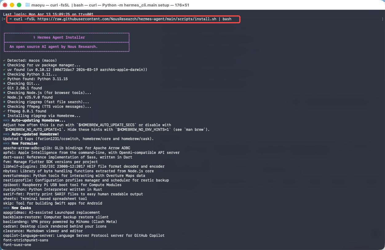 curl -fsSL https://raw.githubusercontent.com/NousResearch/hermes-agent/main/scripts/install.sh | bash