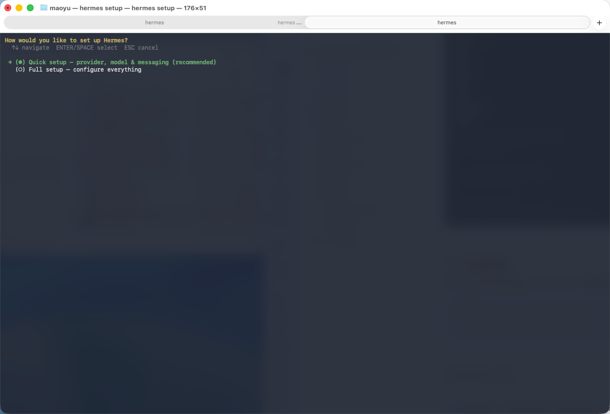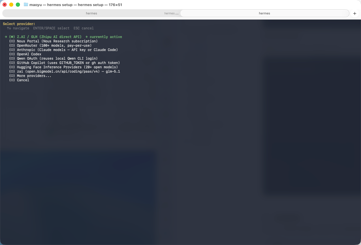 Hermes 不绑定任何模型。后续如果切换模型运行以下命令选择你的 LLM 供应商: