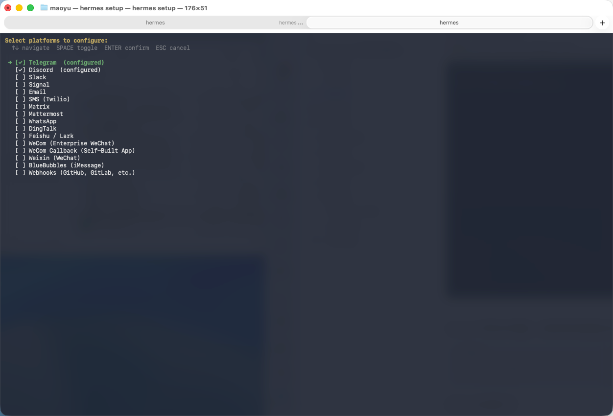 Hermes 可以接入 Telegram、Discord、Slack、WhatsApp、Signal、邮件等平台,在手机上也能用: