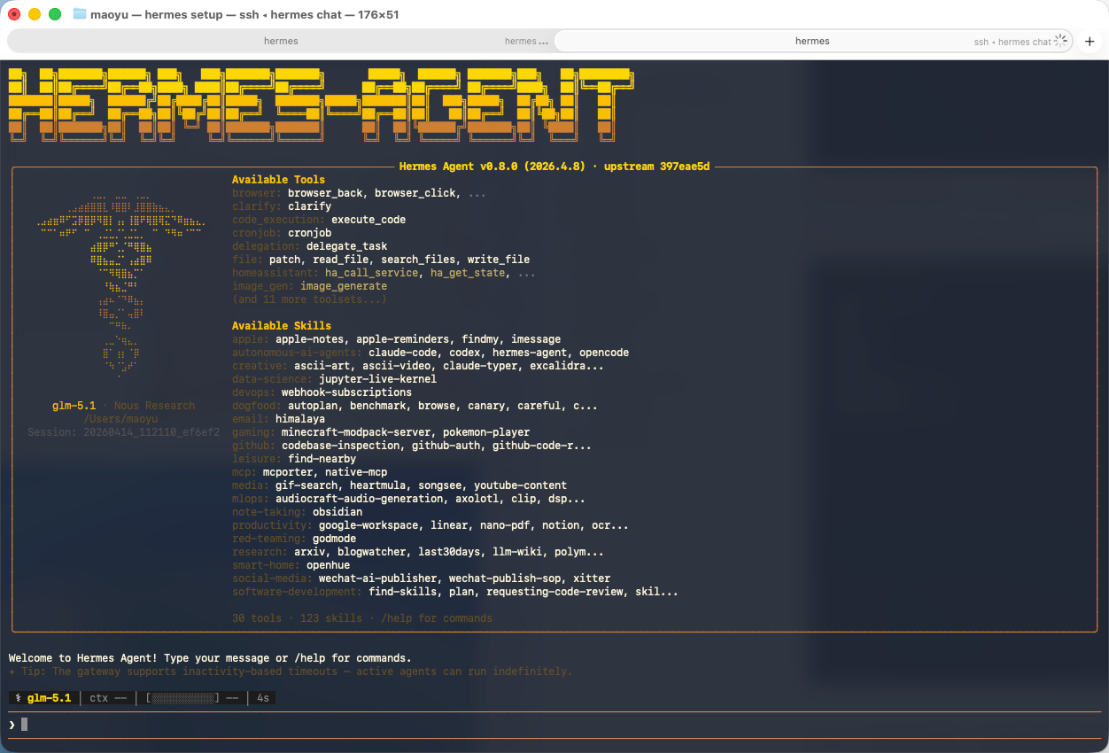 直接输入 hermes 启动对话。你会看到欢迎界面,显示当前模型和可用工具。